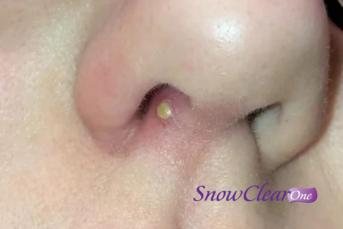 Mụn bọc có nhân trắng thường là kết quả của tình trạng viêm nhiễm nặng. Bên trong nốt mụn chứa dịch mủ trắng gồm tế bào chết, vi khuẩn và bã nhờn tích tụ. Khi mụn vỡ ra, nếu không được vệ sinh đúng cách, vi khuẩn có thể lây lan sang vùng da xung quanh, khiến mụn xuất hiện thêm ở các vị trí khác như cánh mũi hoặc má. Vì vậy, loại mụn này cần được điều trị cẩn thận và giữ vệ sinh kỹ lưỡng để tránh lây lan và để lại sẹo thâm.